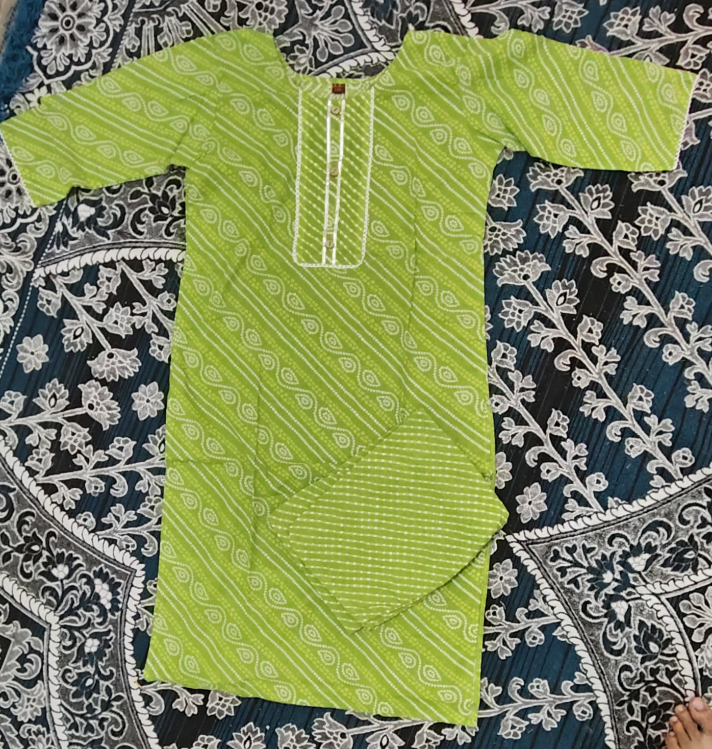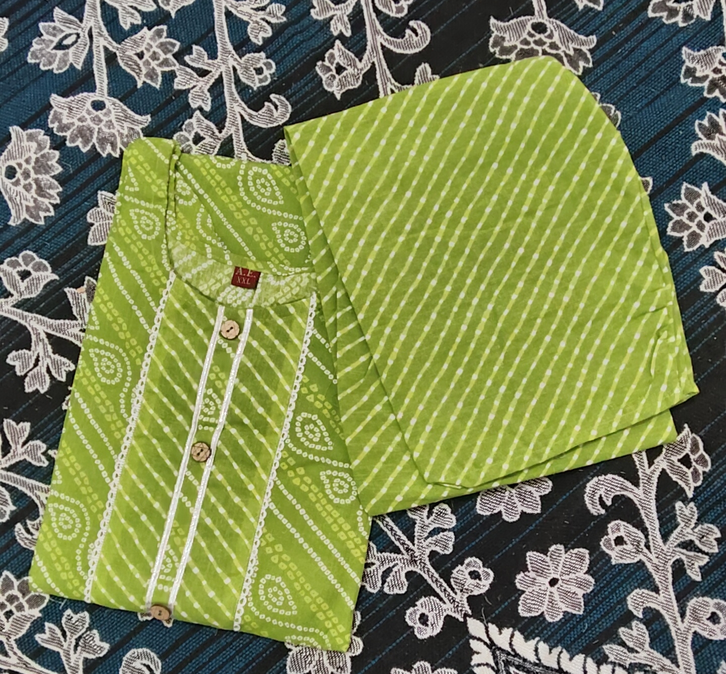 Stylish green printed cotton kurti set designed for comfort and everyday elegance. Featuring a beautiful diagonal stripe pattern, button placket neckline, and 3/4 sleeves, this outfit is perfect for daily wear, office wear, and casual outings.